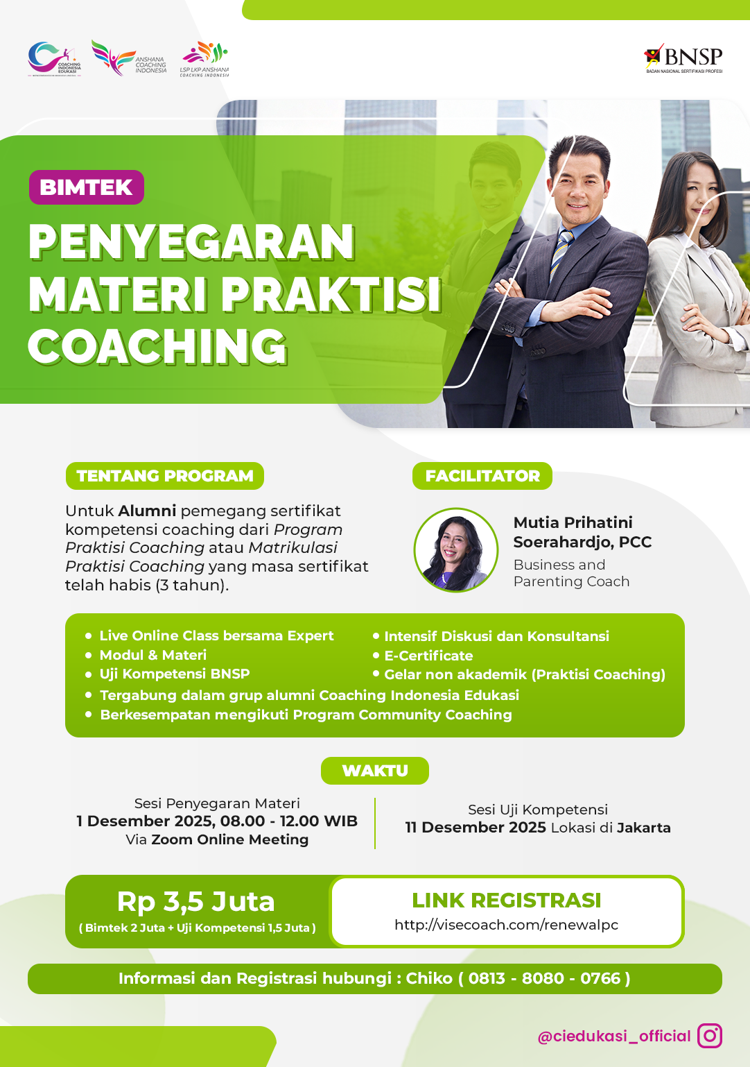 - Penyegaran Skill: Menyegarkan dan memutakhirkan pemahaman terhadap materi dan praktik coaching terkini.