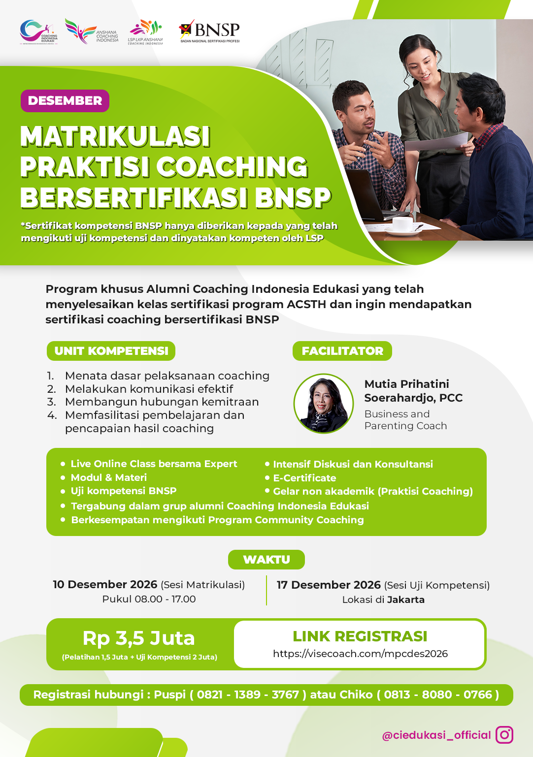 Lebih lengkap tentang Batch 25 - Matrikulasi Praktisi Coaching Sertifikasi BNSP