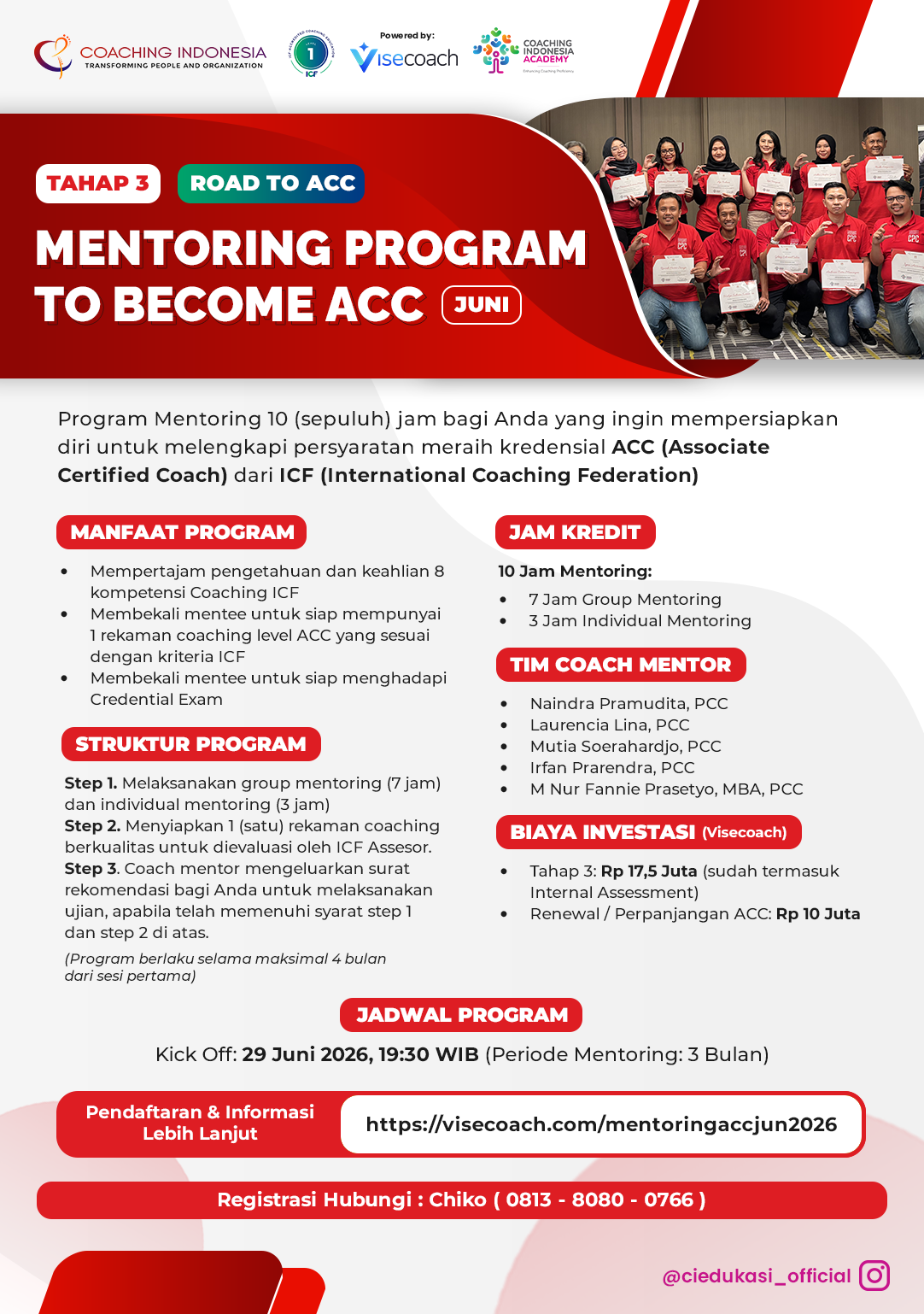 Program mentoring 10 (sepuluh) jam bagi Anda yang ingin mempersiapkan diri mengikuti ujian untuk meraih kredensial ACC (Associate Certified Coach) dari ICF (International Coaching Federation).