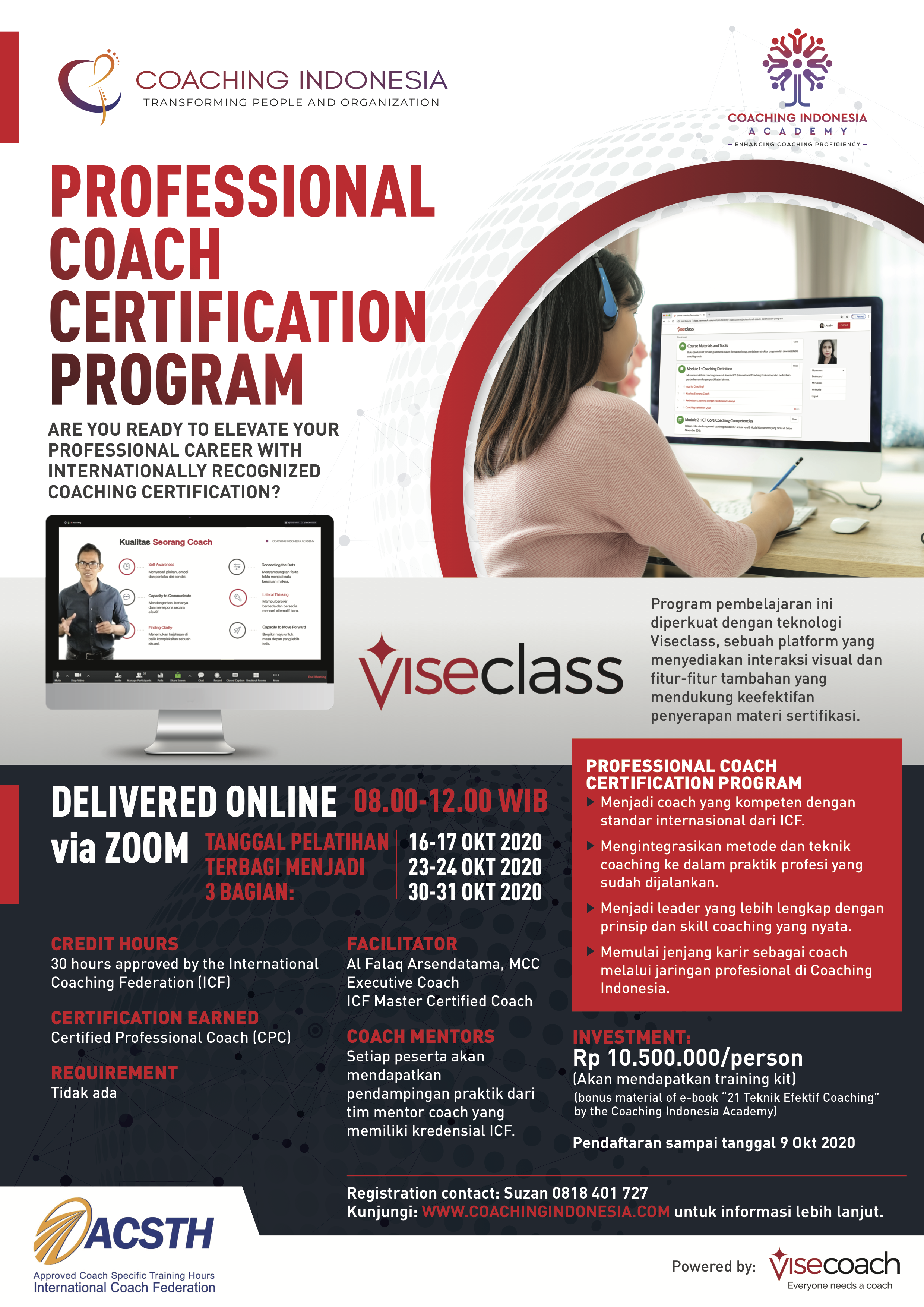 Total 30 jam ACSTH (Approved Coach Specific Training Hours) dari ICF, yang terdiri dari: