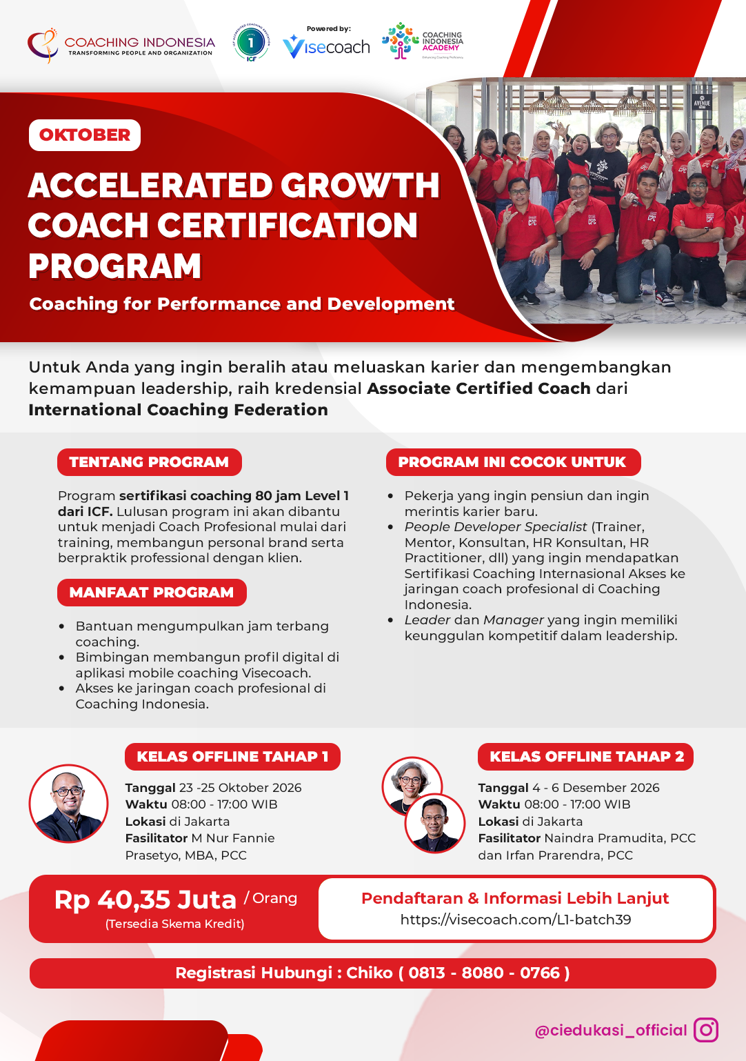 - Diakui 30 jam training berdasarkan Level 1 Akreditasi ICF.